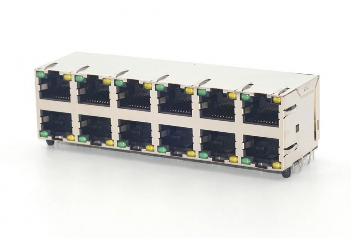 双层RJ45连接器, 2x6Ports,带灯带弹,H=25.4mm