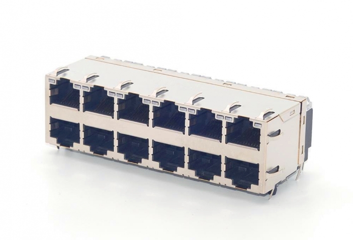 双层RJ45连接器,2x6 Ports,单排灯带弹,H=25.4mm