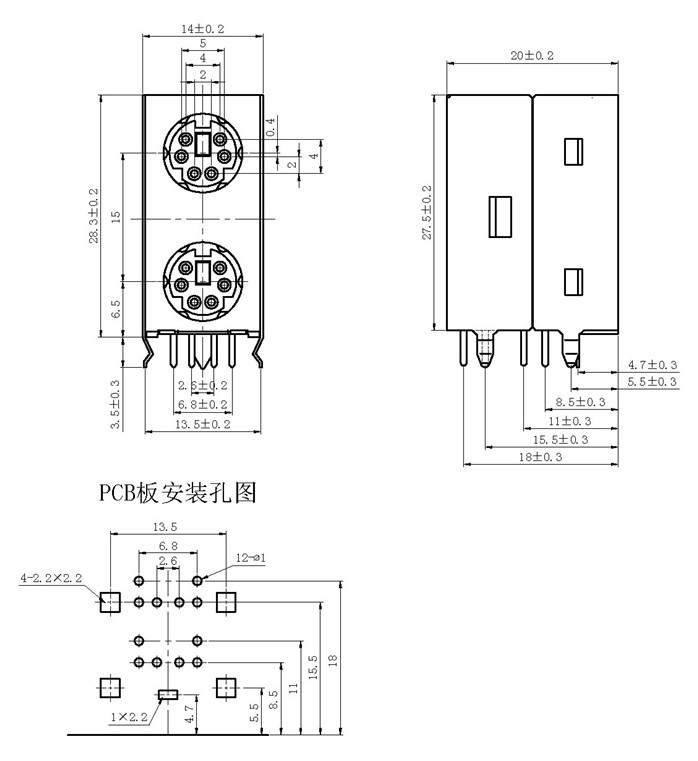 MINI DIN+双层USB(3.0)连接器,鱼叉间距(12.0)
