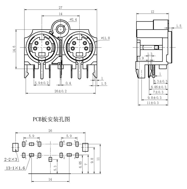MINI DIN+双层USB(3.0)连接器,鱼叉间距(12.0)