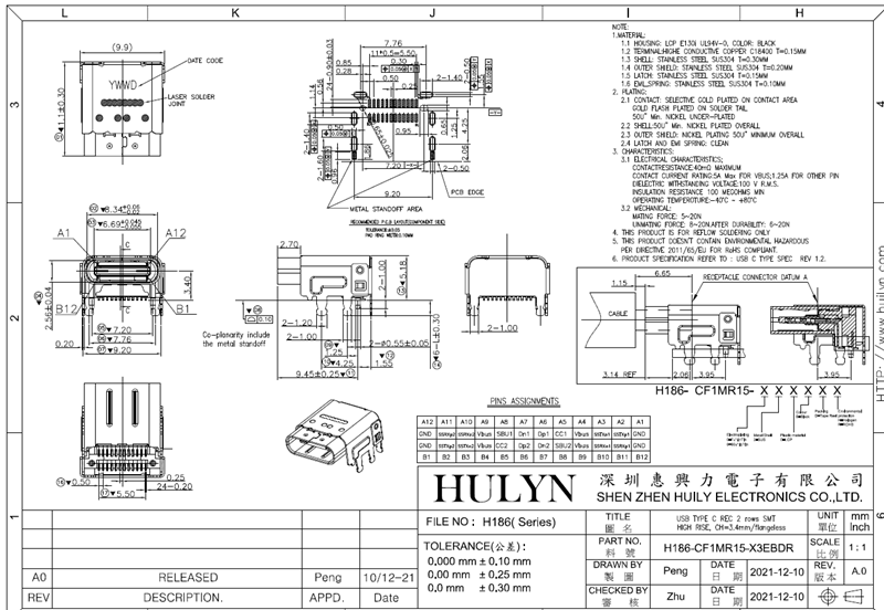 HULYN USB TYPE-C CF 24PIN REC 2 rows SMT HIGH RISE, CH=3.4mm