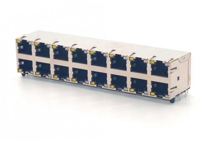 Stacked RJ45 Modular Jack Connector, Side Entry, with LED, 2x8Ports