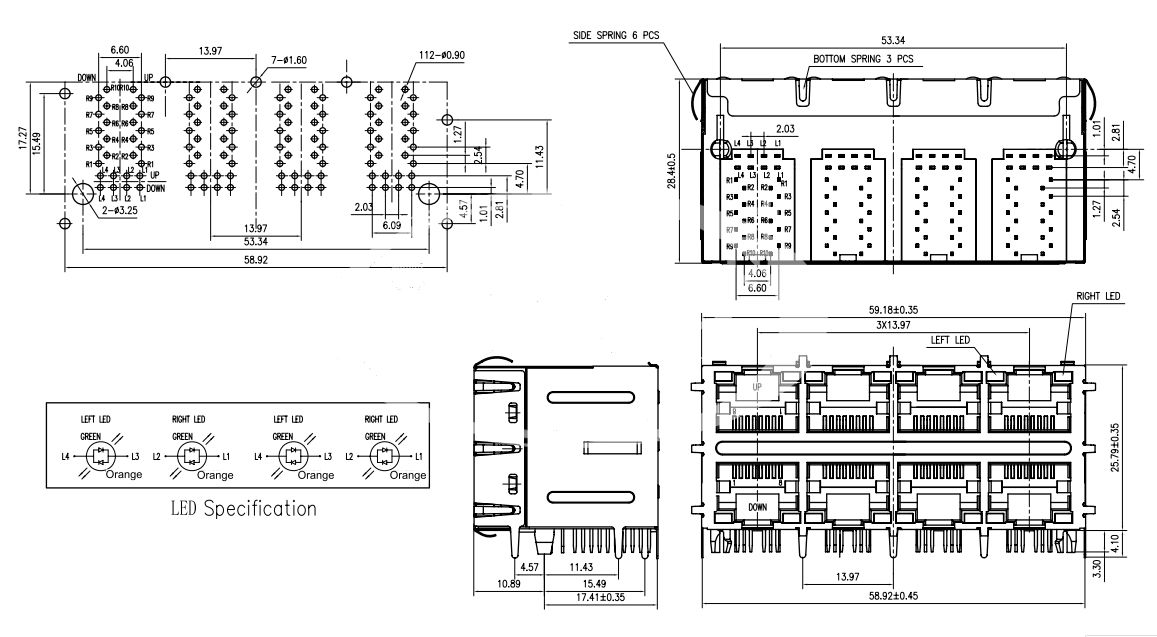 10/100/1000 Base-TX RJ45 2xN Integrated Magnetics Connector, designed tosupport such applications as: Switches, Routers, Servers and Hub.